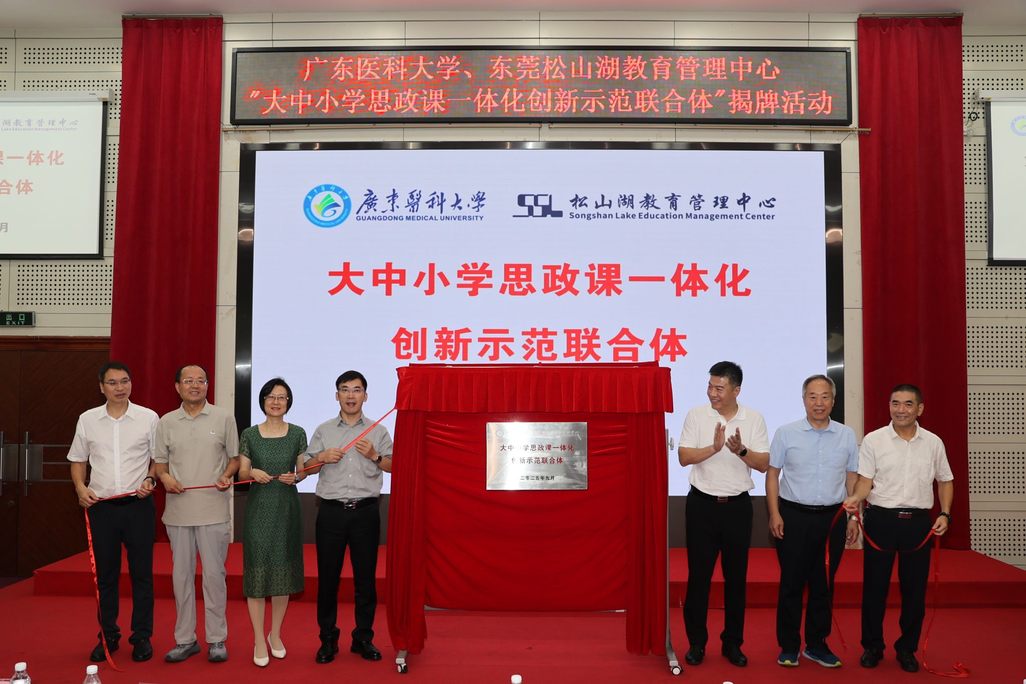 2025年9月19日上午,广东医科大学与松山湖教育管理中心举行的“大中小学思政课一体化创新示范联合体”揭牌活动在我校进行。学校党委常委、副校长佟矿、松山湖宣传教育文体旅游局副局长曾鸣、松山湖多所中小学校长及思政课教师代表、我校全体思政课教师等共160余人参加了此次会议。会议由学校马克思主义学院党委副书记、院长金卓主持。
