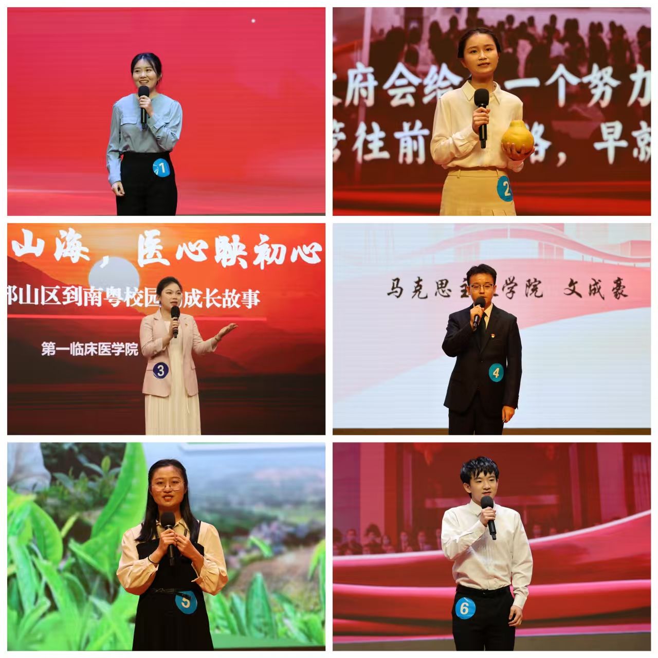 选手们围绕家国情怀、立德树人、医者担当、青春奉献、乡村振兴等主题,以小切口展现大格局,以小故事诠释大思想。宋巧巧以一枚金柚为线索,串联起党群同心、助力乡村振兴的温暖故事,用平凡物件承载深厚情怀;李怡欣、曾皓聚焦医者使命,以“青春赴山海、医心映初心”为核心,深情讲述广东医人坚守岗位、护佑生命的责任担当;陈卓立足红土大地,以“在南粤大地上,做一盏领航的灯”传递扎根基层、服务群众的坚定信念;聂瑞以边疆守护为主题,展现青年学子以仁心赴远方的赤诚与担当;洪彩云以“27岁的重生”为叙事主线,用亲身经历讲述生命的坚韧与力量,细腻真挚的细节打动全场;赵凯莉、文成豪、万诗画、杨滟萍等选手也各展风采,从地域变迁、基层扎根、育人初心到生命影响生命,多角度诠释理论与实践的深度融合,赢得现场阵阵掌声。