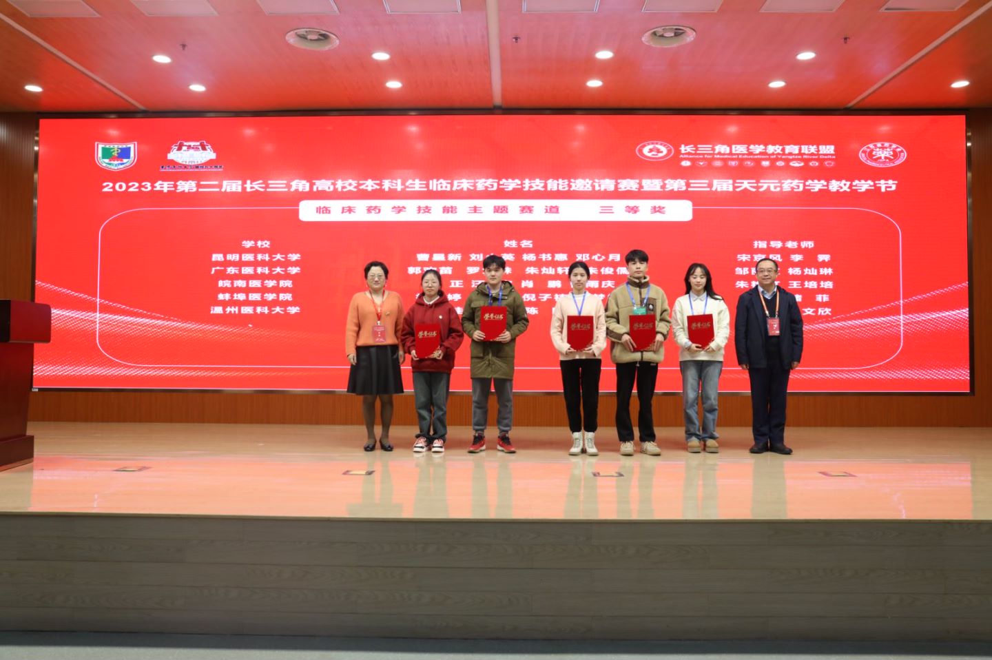 12月1日—3日,由全国药学类院校大学生专业技术与实验技能竞赛组委会和长三角医学教育联盟主办、南京医科大学承办、江苏省药学会协办的第二届长三角高校本科生临床药学技能邀请赛在南京举行,来自上海交通大学、中国药科大学、南京医科大学、安徽医科大学、新疆医科大学、广州医科大学等13所知名高校的临床药学专业学生同台竞技,各展风采。经过激烈角逐,我校代表队斩获临床药学服务主题赛道一、二等奖,临床药学技能赛道三等奖,实现了我校在临床药学专业本科技能竞赛获奖的突破。