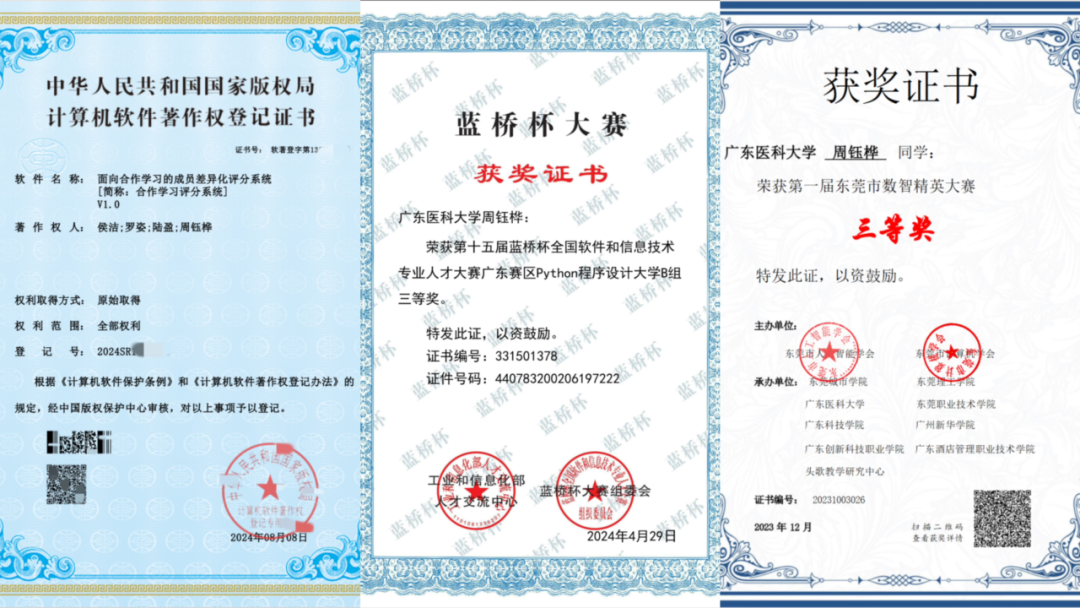 精进学业之余,周钰桦还积极参与各类重要赛事并斩获奖项,包括全国大学生生物医学工程创新设计竞赛三等奖、蓝桥杯全国软件和信息技术专业人才大赛广东赛区Python程序设计大学B组三等奖等。