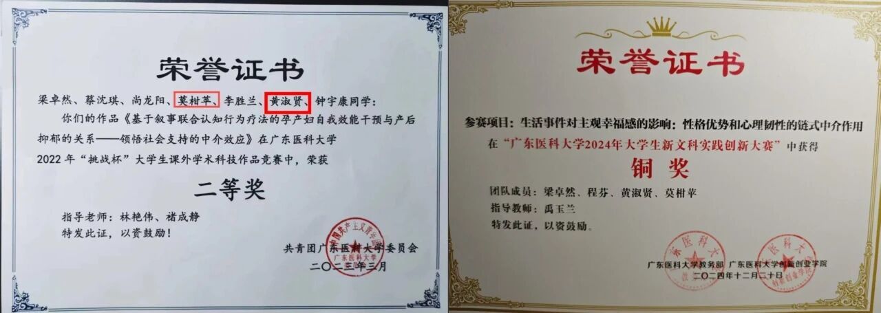 课余时间,宿舍积极参与各类科研学术竞赛,提升综合素质。宿舍四人积极参与科研项目,获院本科生科研项目重点立项;莫柑苹和黄淑贤积极参加挑战杯比赛,获得第十七届“挑战杯”广东大学生课外学术科技作品竞赛三等奖、广东医科大学大学生新文科实践创新大赛铜奖等奖项;方妙旋作为项目成员,获大学生创新创业训练计划项目省级立项。