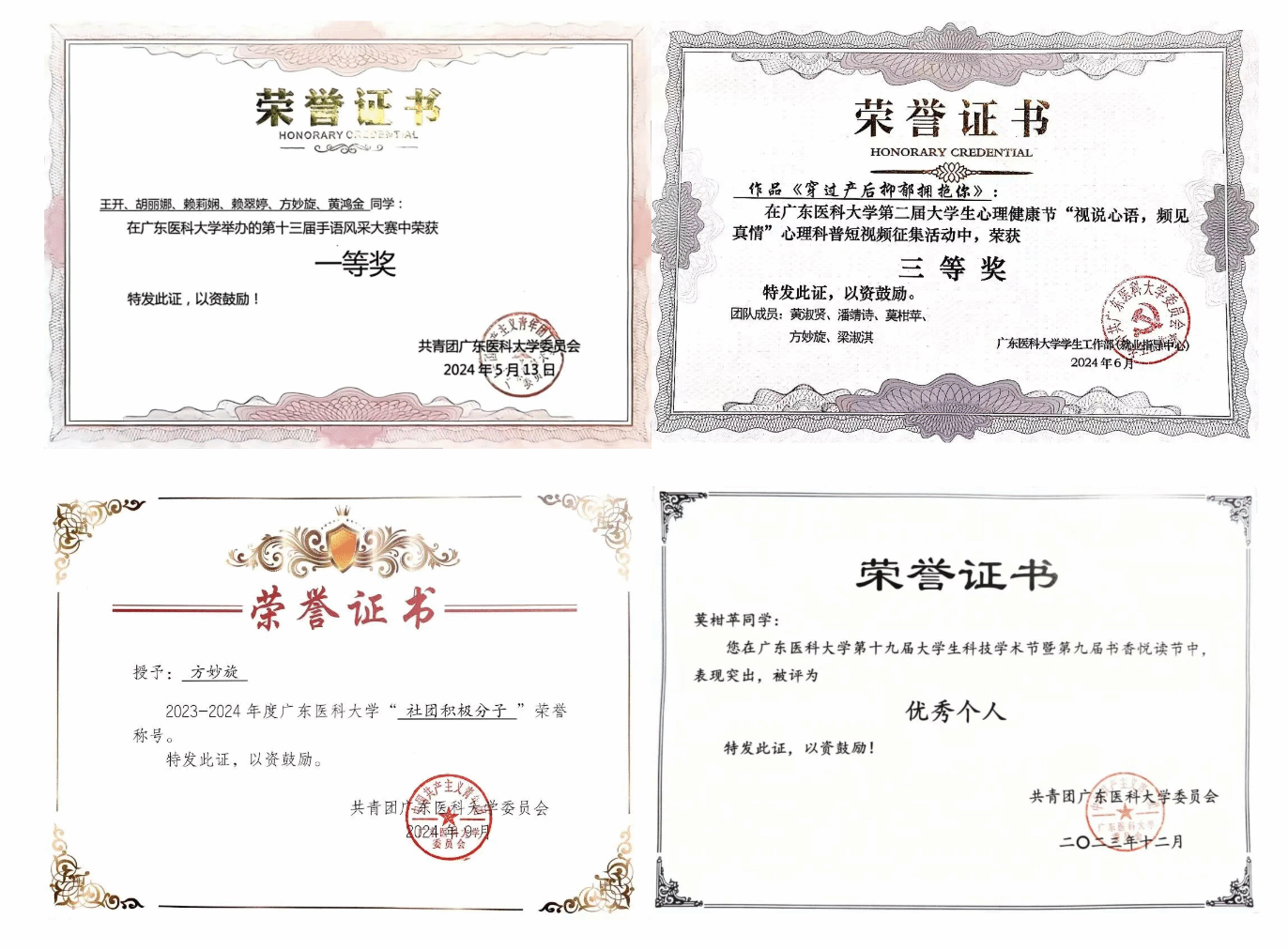 在丰富多彩的校园生活中,宿舍四人亦积极投身于各类文体活动,不断挑战自我、提升综合素养,积极参与校园文体艺术节、生命文化节、科技学术节、书香悦读节等多项文艺活动,获得新媒体创意设计大赛二等奖、手语风采大赛一等奖、“献礼二十大,奋进新征程”系列活动之摄影比赛三等奖、心理科普短视频征集活动三等奖等。