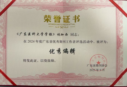2025年9月16日,广东省期刊协会第八届第三次会员代表大会于广州隆重召开。会议期间,举行了“广东省优秀期刊工作者”颁奖仪式,对在全省期刊领域作出突出贡献的个人进行表彰。广东医科大学学报编辑部林加西副编审荣获“优秀编辑”称号。