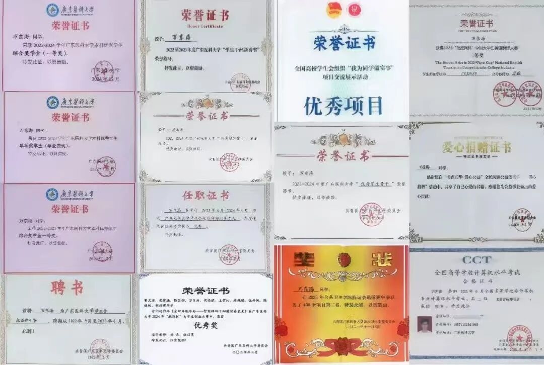 万东海并非浅尝辄止,而是将热情转化为成果:他所参与的科研项目荣获“挑战杯”广东大学生创业计划竞赛省级铜奖,主持或参与的创新创业项目也成功获得校级立项。