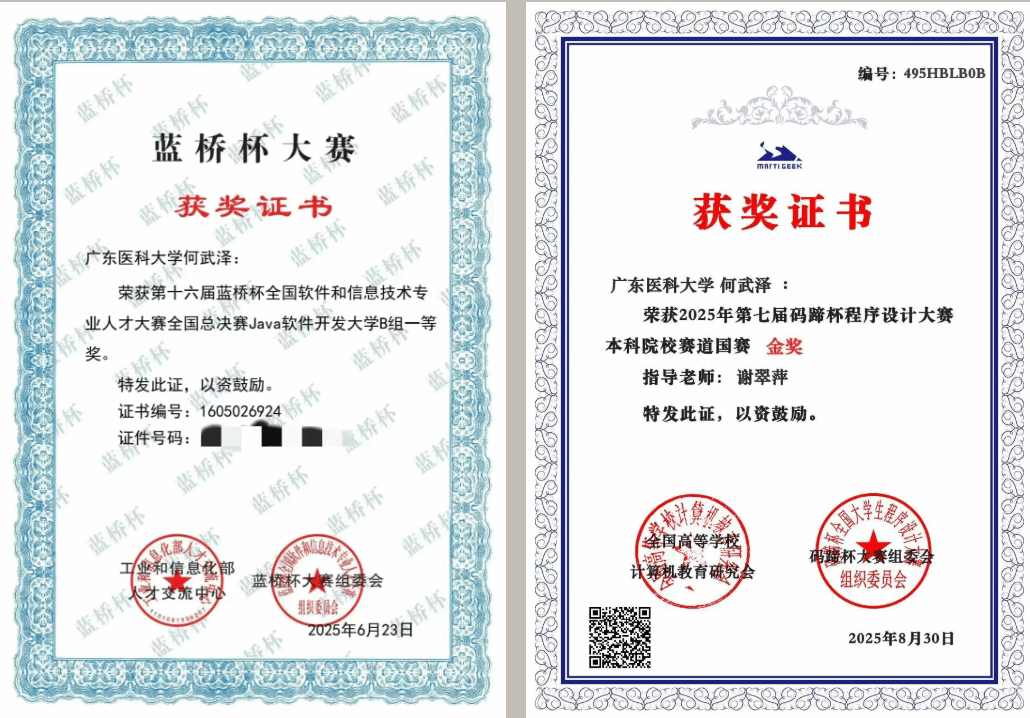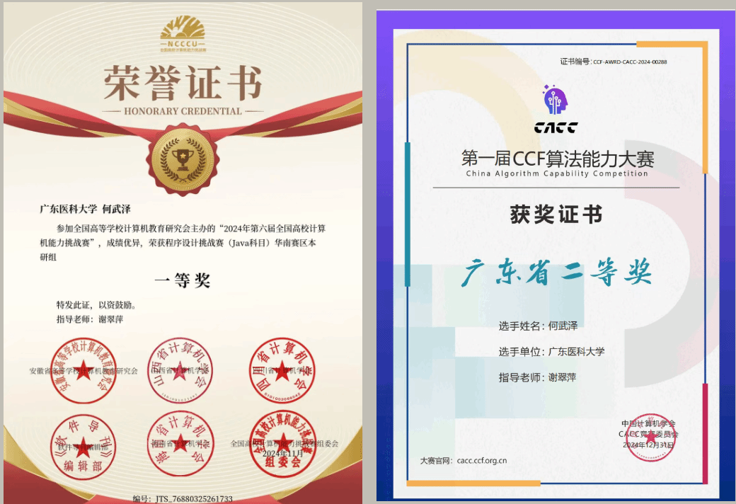 在教育部观察名单赛事及省级竞赛中,荣获2024-2025年度全国大学生计算机应用数字素养大赛(暨第七届传智杯程序设计挑战赛)全国总决赛一等奖、第六届全国高校计算能力挑战赛Java组华南赛区一等奖、第一届CCF算法能力大赛广东省二等奖、第三届大学生算法大赛全国总决赛一等奖、第四届广东医科大学ACM程序设计大赛一等奖收入囊中,成为跨赛道、多领域的“获奖常客”。