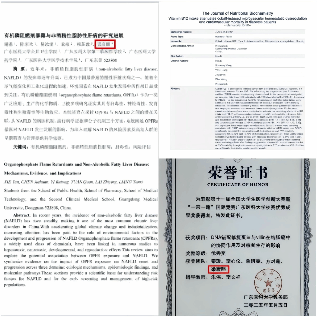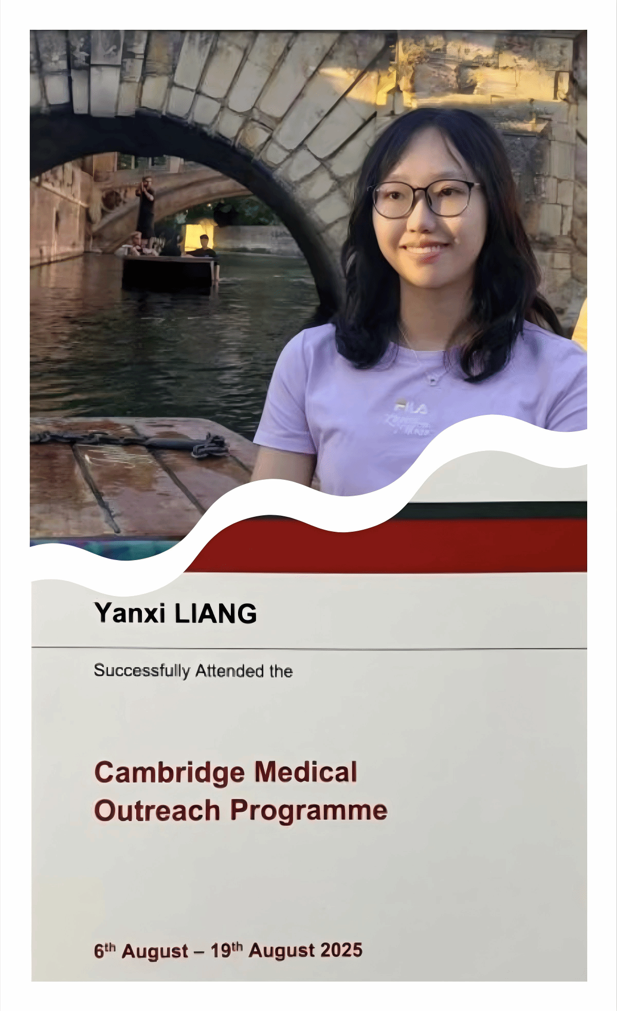 入学以来,她斩获 2024—2025 学年国家奖学金、综合一等奖学金等荣誉。怀揣医学热忱,主动投身科研与竞赛,获全国大学生医学创新大赛校赛优秀成果奖、校级医学文献综述大赛三等奖,参与校重点科研项目研究,撰写多篇学术综述,更跻身剑桥医学交流项目,在全英文研讨中拓宽学术视野,坚定转专业至医学检验技术的深耕之路。