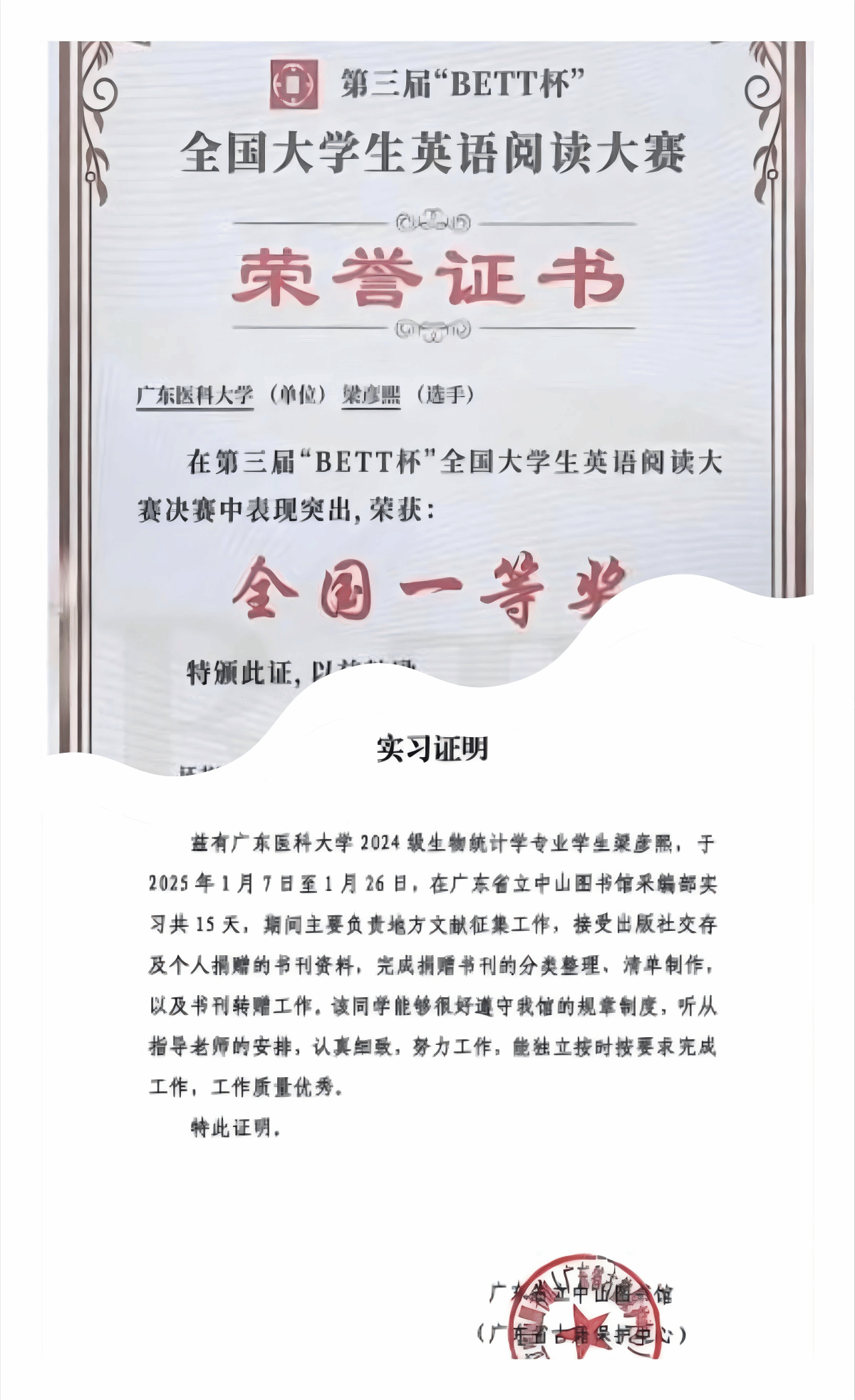 她始终坚信实践是成长的沃土,将课堂所学转化为躬身笃行的力量。不仅在广东省立中山图书馆实习中,以严谨细致的态度完成文献整理工作,更走出国门参与剑桥医学交流项目,在全英文环境中深耕专业领域、分享研究成果。311 小时的志愿时长里,从校园后勤到社会服务,每一次付出都彰显着新时代大学生的责任与温度,让青春在实践中绽放别样光彩。