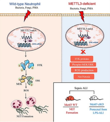 本研究首次明确了METTL3-SYK这一表观转录组学轴在NETosis中的调控作用。证实了靶向m6A“书写器”可以精准调控中性粒细胞介导的过度炎症,而不完全抑制其抗菌防御功能。