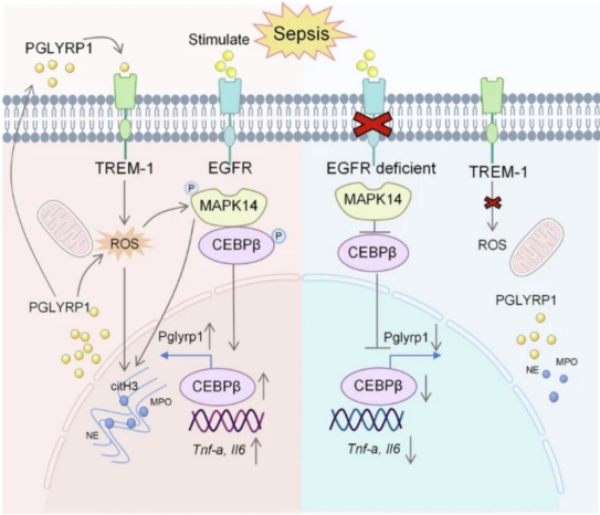 表皮生长因子受体(EGFR)正是中性粒细胞内在调控NETosis的关键因子。首先在临床样本中发现,脓毒症患者中性粒细胞的EGFR表达水平显著升高,且与疾病严重程度直接相关。为验证EGFR的作用,研究人员构建了中性粒细胞特异性EGFR敲除小鼠模型,结果显示,这类小鼠在发生多菌性脓毒症后,细胞因子风暴、组织损伤及NET形成均明显减轻,生存率大幅提升。深入的机制研究进一步揭开了EGFR调控NETosis的“信号链条”:EGFR会与CEBPβ结合,同时招募MAPK14对CEBPβ进行磷酸化修饰。被激活的CEBPβ会进入细胞核,启动PGLYRP1的转录过程。而水平升高的PGLYRP1又会通过自分泌方式激活TREM-1,进一步放大NET释放,形成一个不断加剧炎症的“正反馈环路”。