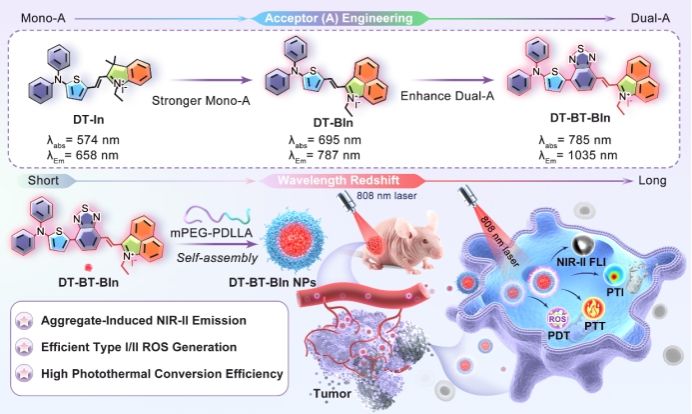 近日,广东医科大学医学技术学院陈晓辉教授团队联合深圳大学王东教授和燕鼎元研究员,在国际知名学术期刊《Aggregate》(中科院1区TOP期刊,影响因子13.7)发表了题为“A Dual−Acceptor Engineered Second Near-Infrared Ionic Aggregation-Induced Emission Luminogen for Mitochondria-Disrupted Cancer Phototheranostics”的研究论文,创新性提出双受体工程化策略,开发离子型NIR-II AIE光诊疗剂,实现线粒体破坏驱动的精准抗肿瘤。