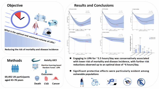 鉴于此,本团队基于英国生物银行样本库(UK Biobank),开展了一项前瞻性大型队列研究,探索客观测量的轻体力活动与死亡及主要疾病(包括心血管疾病和癌症)风险之间的剂量-反应关系,确定有益于人体健康的轻体力活动最低和最佳时长。结果表明,每天进行约3.5h轻体力活动可有效降低死亡和主要疾病发生风险,而最佳剂量大约为每天6h。此外,这种保护效应在易感人群中(如老年人、女性、健康状态不良和中高体力活动较少群体)尤为显著。本研究结果具有重要的公共卫生与临床指导价值,为未来身体活动指南纳入轻体力活动的具体推荐剂量提供了证据支持,有助于通过提升日常活动量来降低人群疾病负担。