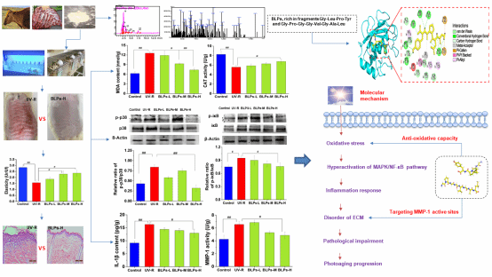 长期紫外暴露诱导的皮肤光老化是当今皮肤科学的研究热点,内在途径修复受损细胞弹性结构和生化代谢微环境失衡,从而在功能上改善光老化皮肤的力学性能已是新一代护肤品开发的必然趋势,而食源性蛋白肽在此方面已显示独特作用。本研究靶向长期紫外光辐照下的氧化应激和炎性反应,通过定向生物酶解技术,从牛源弹性蛋白中制备了具有显著改善SD大鼠皮肤光老化效应的新型抗皱肽,LC-MS/MS质谱鉴定分析表明该蛋白水解物富含Gly-Leu-Pro-Tyr 和 Gly-Pro-Gly-Gly-Val-Gly-Ala-Leu序列,可显著抑制紫外线诱导的MAPK和NF-κB信号通路过度活化,从而降低皮肤组织炎性细胞因子水平,缓解皮肤微环境的代谢失衡。进一步采用分子对接理论分析,发现上述肽段主要通过氢键和疏水相互作用,与基质金属蛋白酶MMP-1上的四个氧化敏感型半胱氨酸残基进行强分子相互作用,且协同靶向抗氧化而发挥显著抗光老化效应。本研究为开发新型防晒蛋白肽功能配料提供了思路借鉴和实验支撑。
